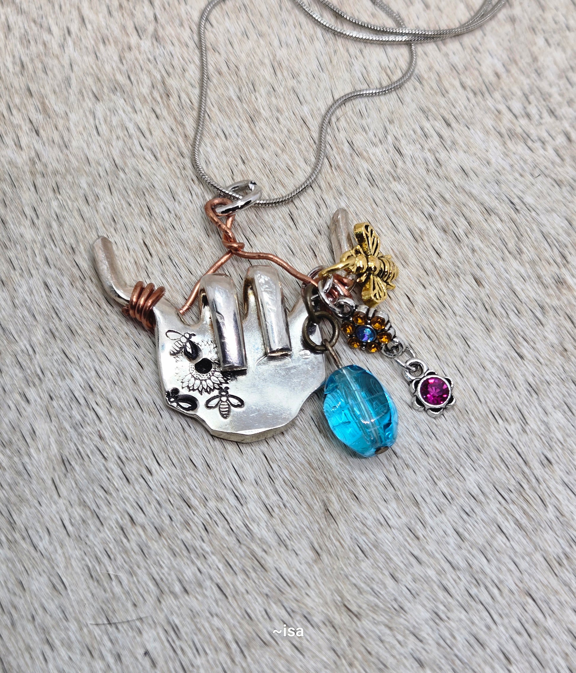 Buzz around in style with the Bee Hiefer necklace. Featuring hand-stamped bee and flower designs on a fork pendant, this jewelry is perfect for the nature lover looking for a unique accessory. Get ready for compliments!