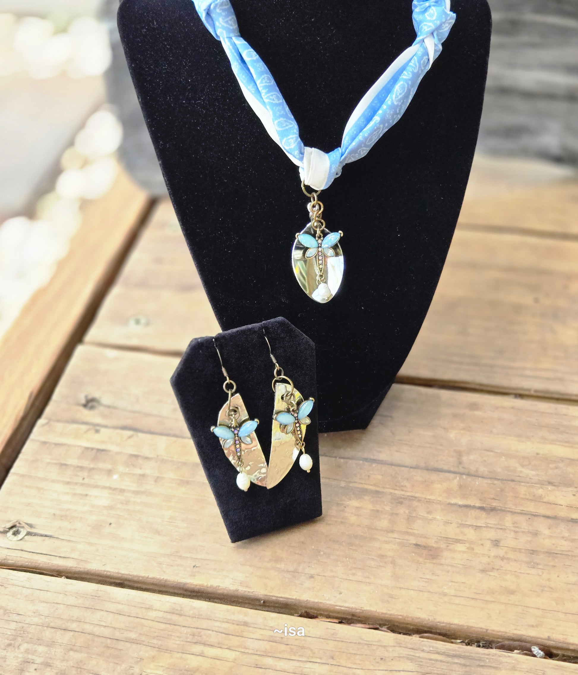 Indulge in the pure fun and elegance of our Blue Fall Set. This scarf necklace features a delicate dragonfly design, perfect for the autumn season. Elevate your style with this sweet accessory and embrace the sophistication of fall.