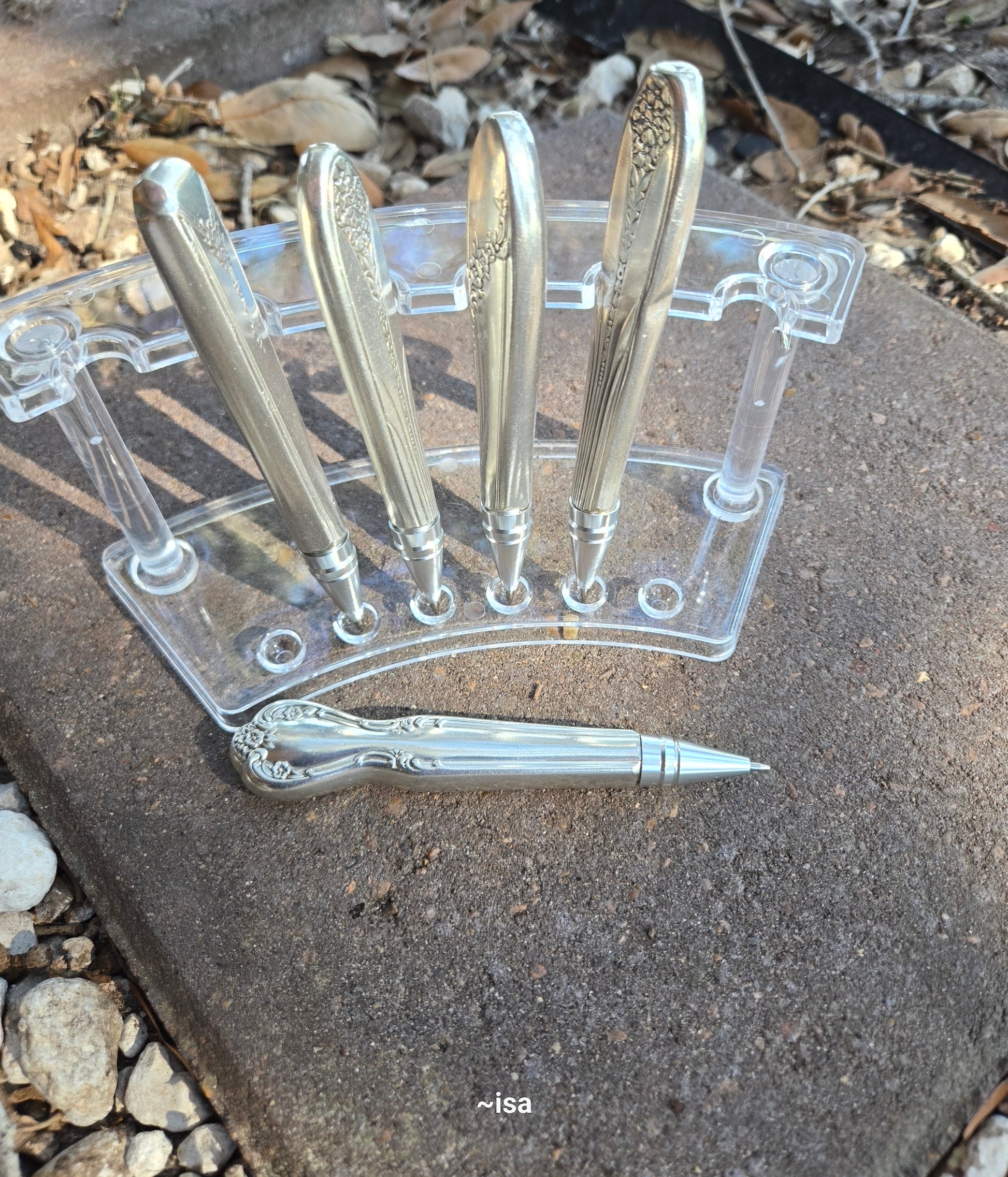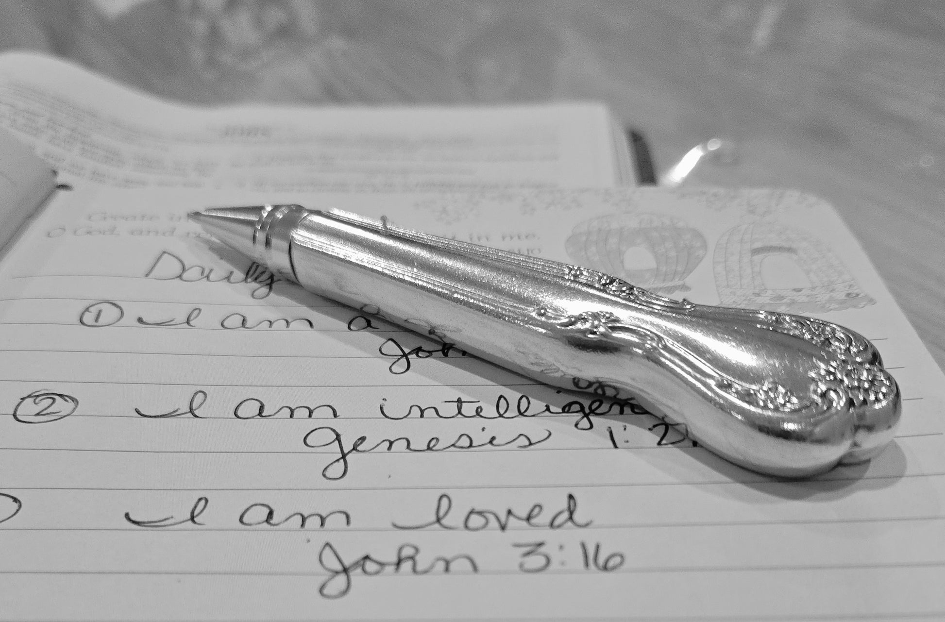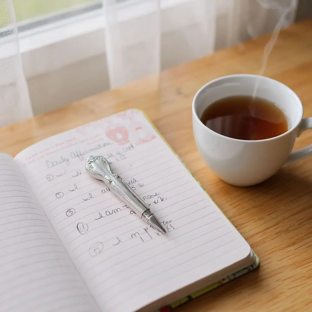 Indulge in Southern charm with the Bougie Butter Pen™ - a silver-plated, vintage-inspired butter knife pen that glides smoothly with every stroke. This pen comes with a linen-bound mini notebook and a scripture card insert, making it perfect for jotting down prayers, praises, or boutique brainstorms. **Random pen selected upon selection**