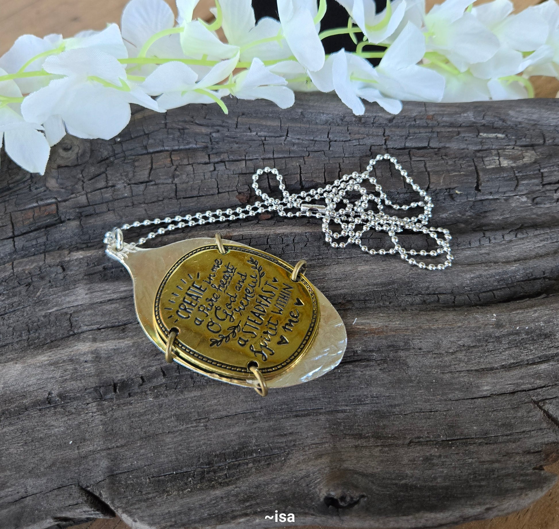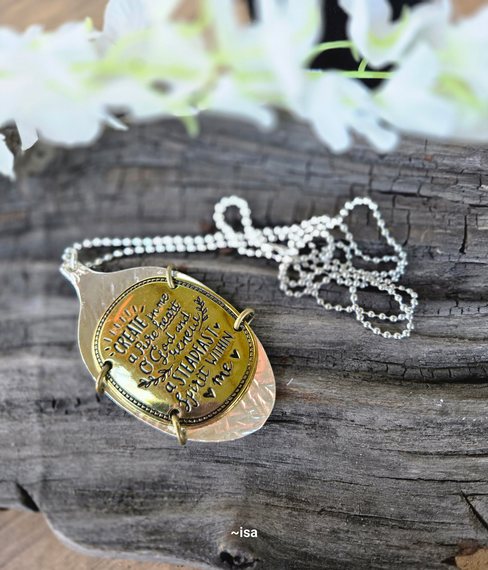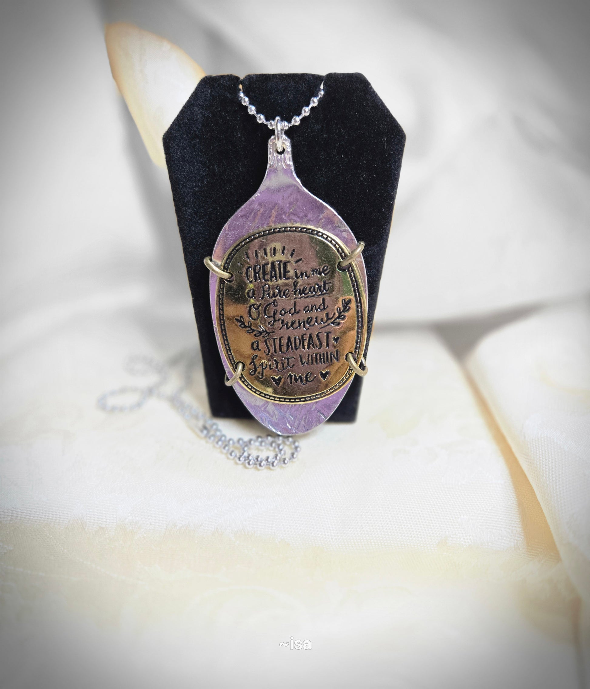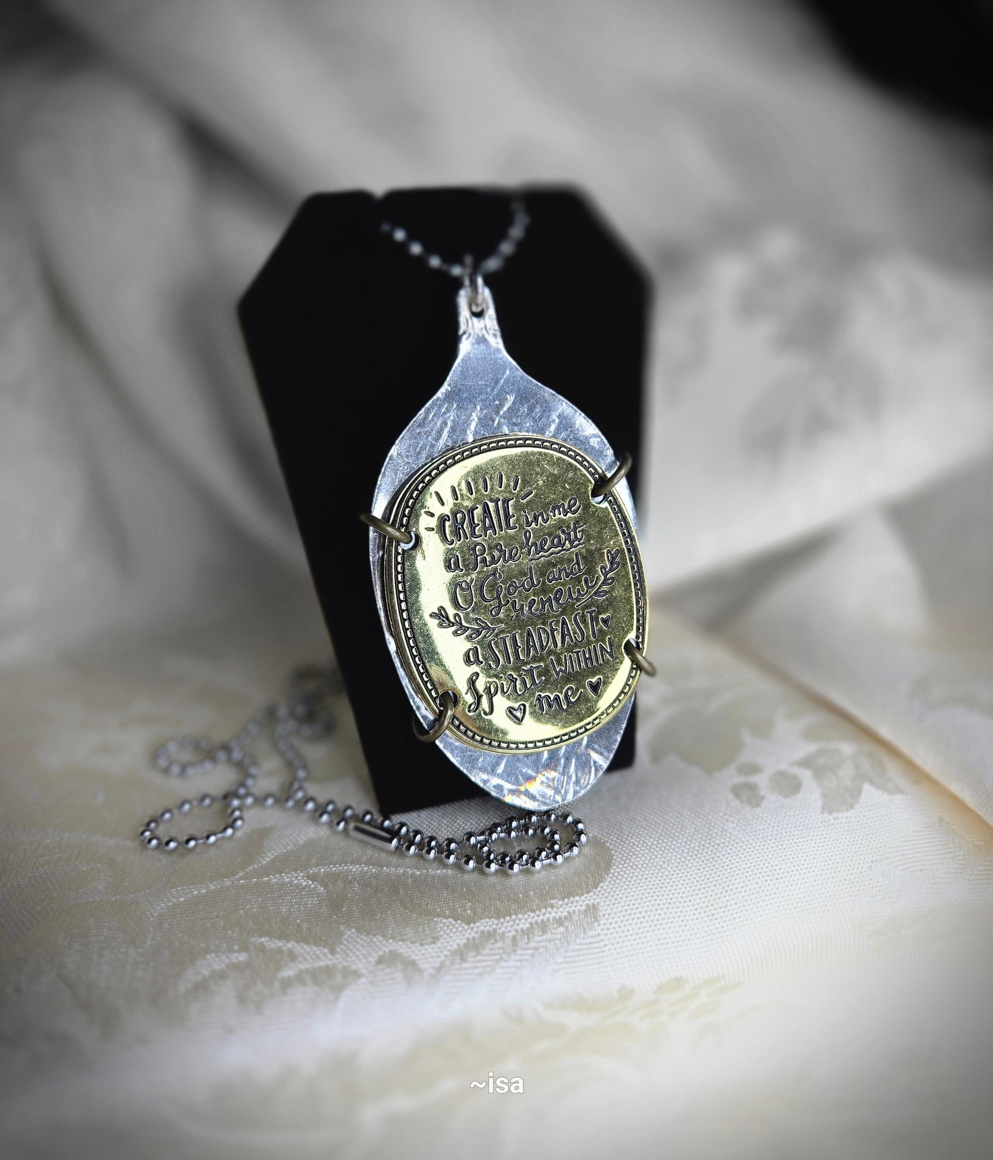 "Unleash your daring spirit with Create In Me. This unique gold pendant features the inspiring verse, 'Create in me a pure heart', delicately engraved onto a silver spoon bowl. The 30-inch ball chain necklace adds a touch of edgy style. Get ready to take on new challenges with this bold accessory!"