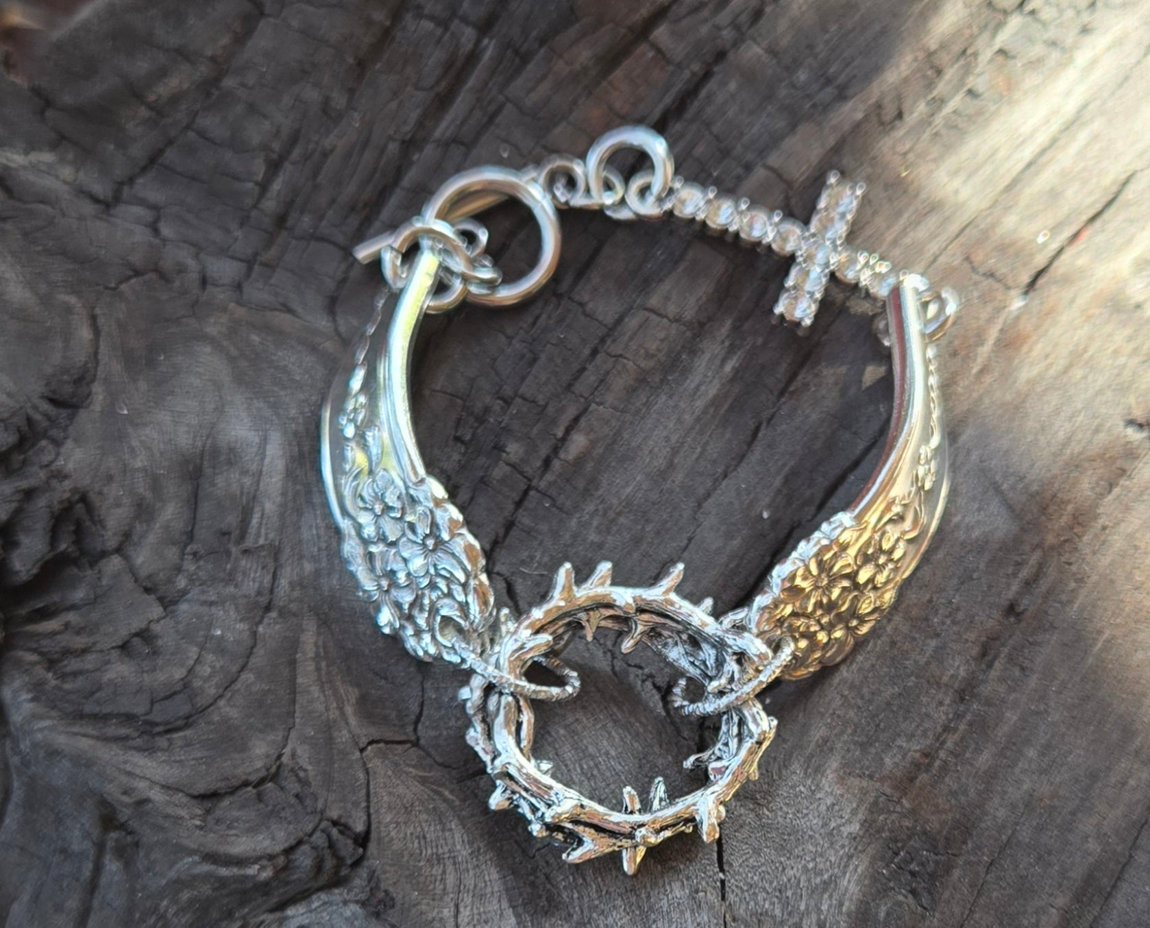 Unleash your inner faith with our Crown of Thorns bracelet. The double handle design showcases a stunning crown of thorns and a cross, symbolizing the sacrifice and resurrection of Jesus. Walk confidently in your beliefs with this powerful accessory.