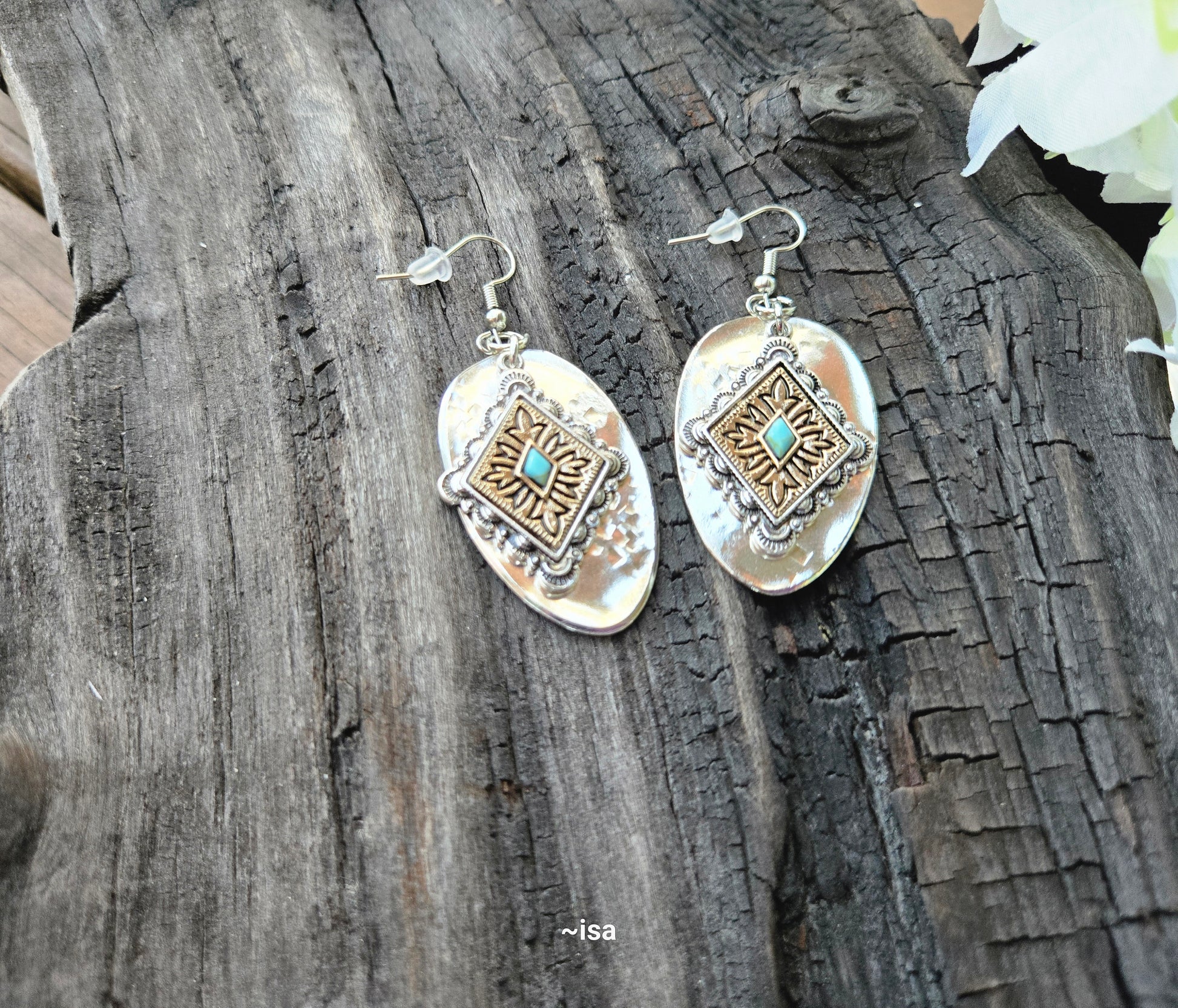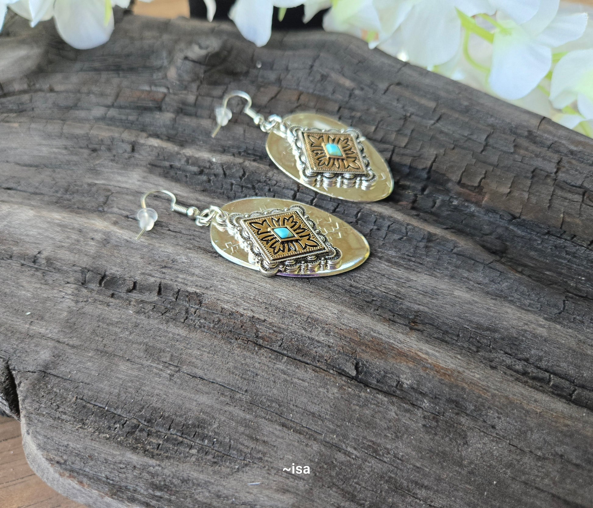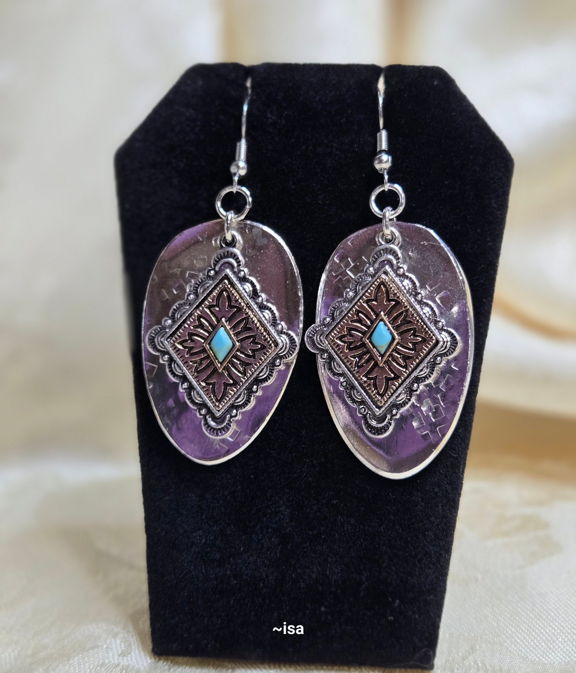 "Get the perfect blend of elegance and playfulness with these Silver Plated Diamond Torquoise Earrings. The diamond-shaped design is accentuated with a beautiful Torquoise stone, making it a unique addition to your jewelry collection. These spoon bowl earrings are sure to add a touch of glamour to any outfit.