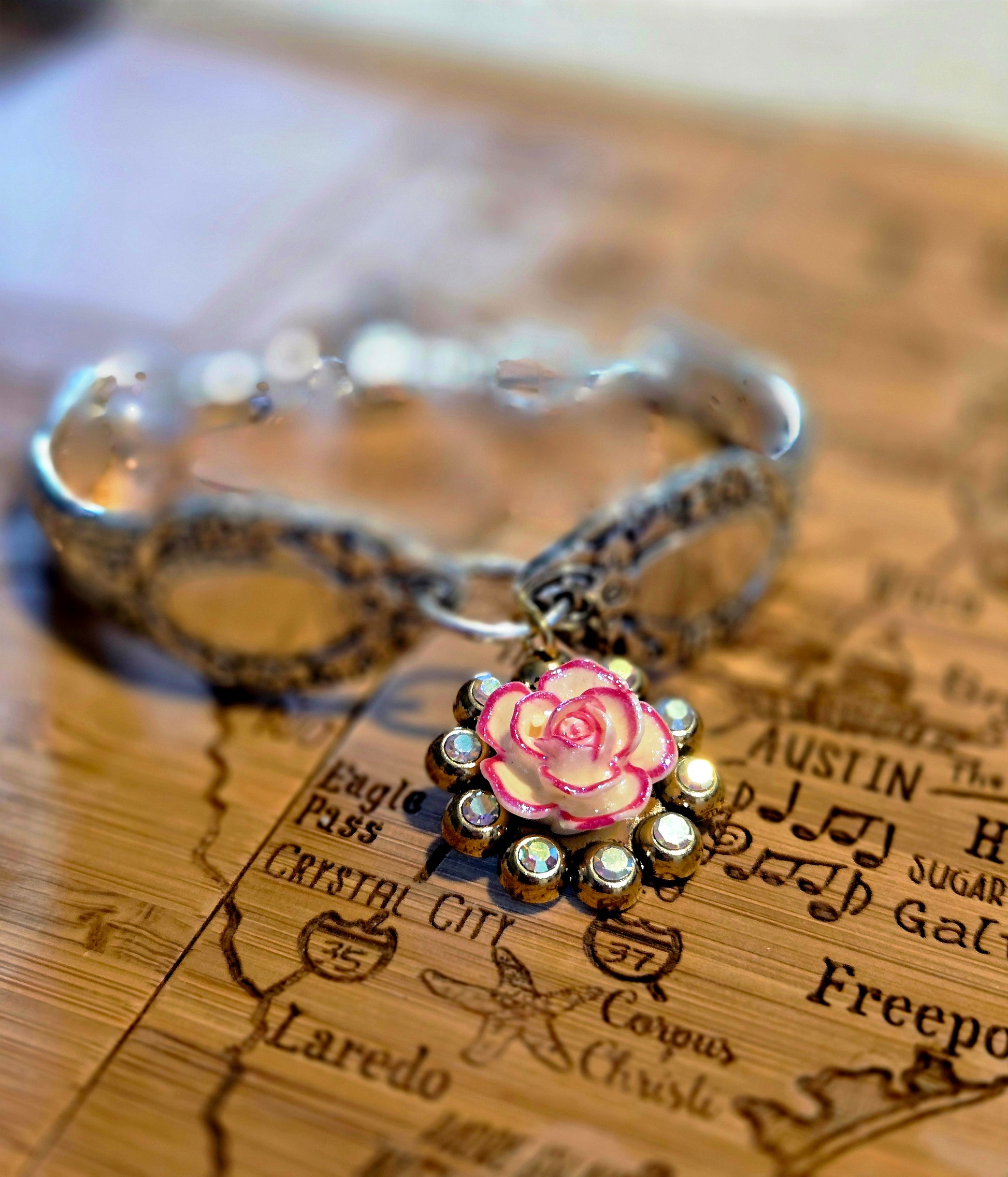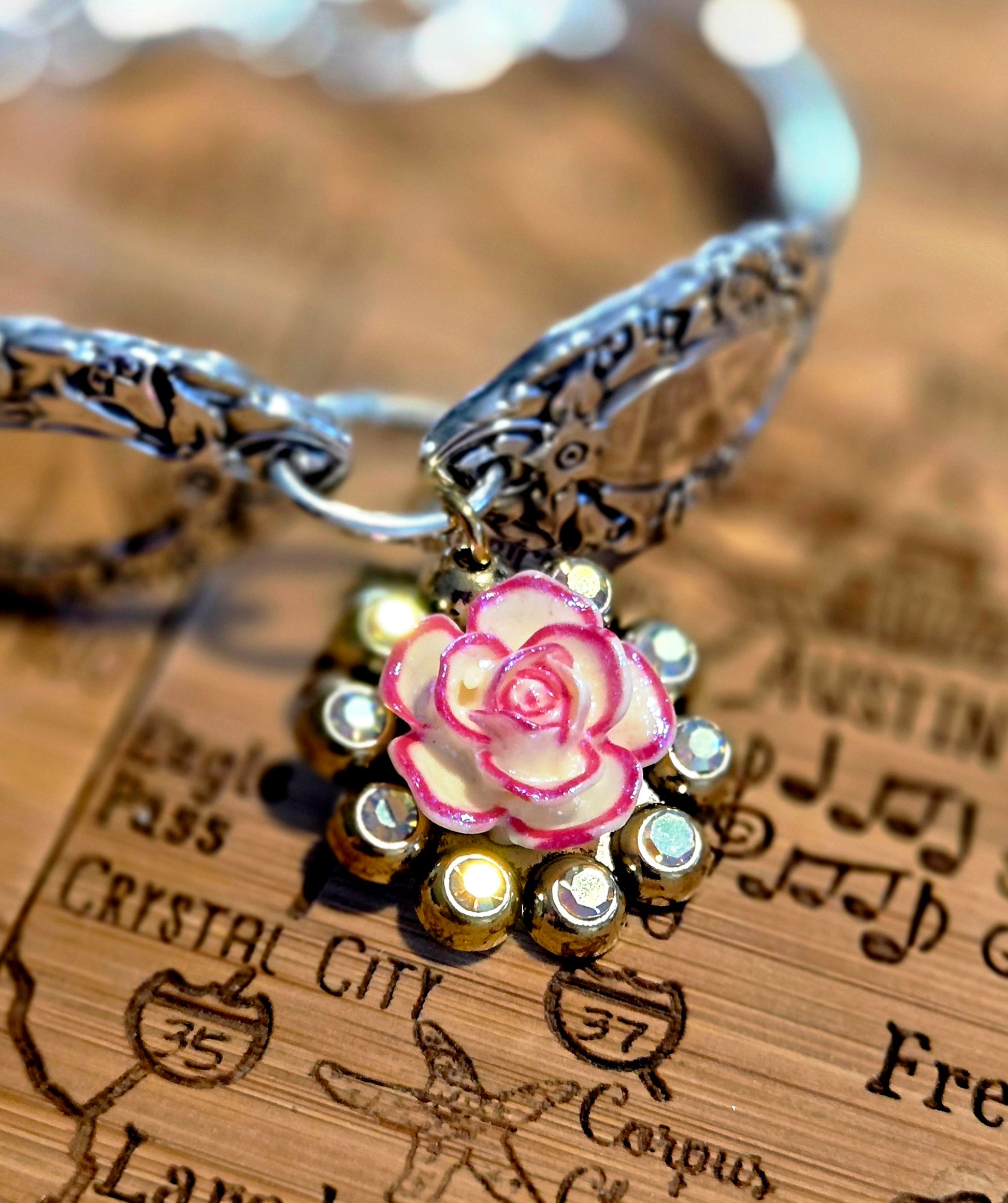 Two spoon handles, rescued from the dinner table and reborn as arm bling—linked by silver-plated rings and fastened with either a clasp: magnetic (for the multitasker), toggle (for the classic queen), or a heart crab clasp (for the hopeless romantic with a wild side). Each piece flaunts either a bougie charm or a mixed silver-tone elite watch face that says, “I’m timeless, darling.” No duplicates. No apologies. Just pure sass, sparkle, and silverware swagger.