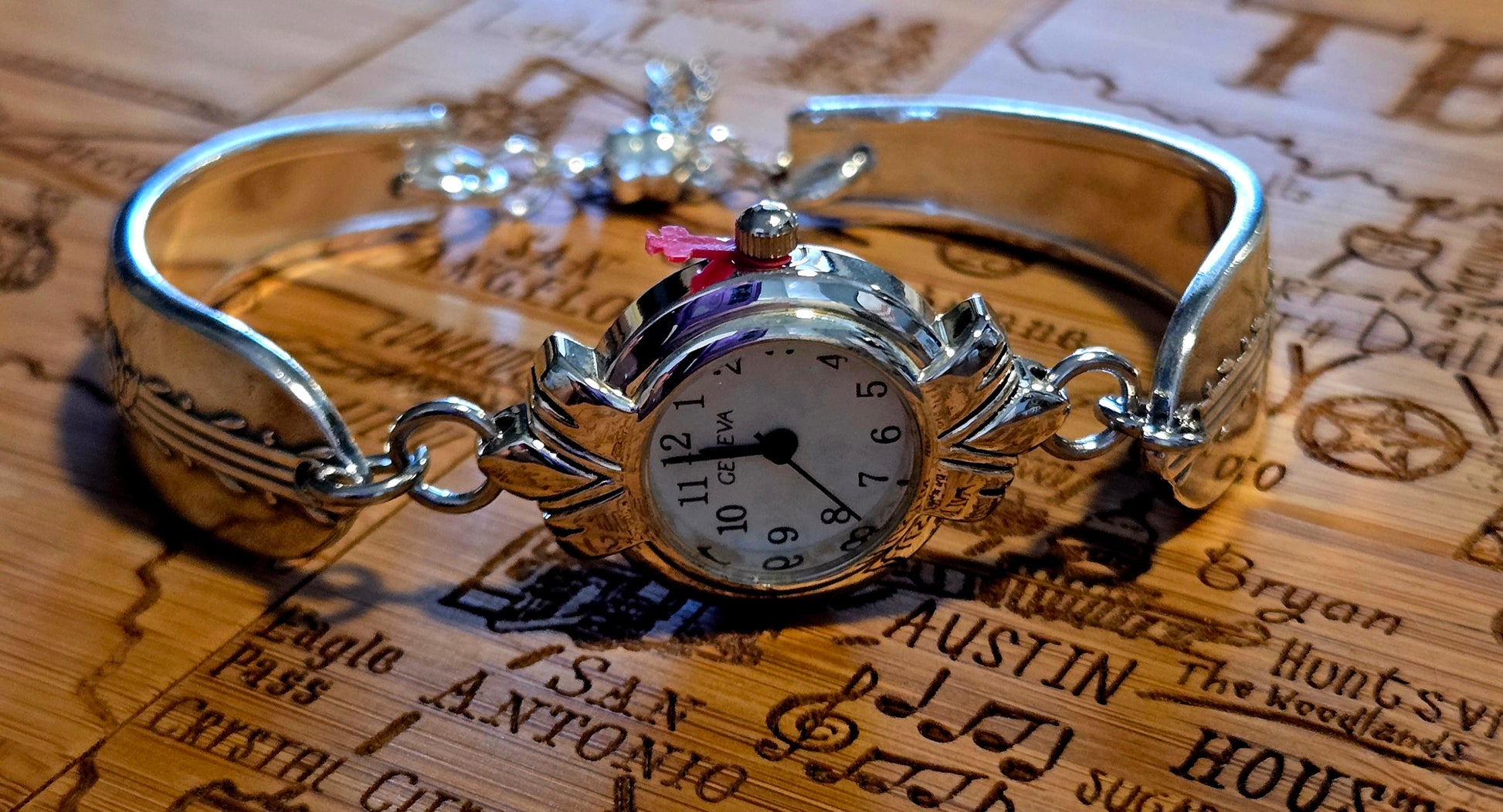 Two spoon handles, rescued from the dinner table and reborn as arm bling—linked by silver-plated rings and fastened with either a clasp: magnetic (for the multitasker), toggle (for the classic queen), or a heart crab clasp (for the hopeless romantic with a wild side). Each piece flaunts a mixed silver-tone elite watch face that says, “I’m timeless, darling.” No duplicates. No apologies. Just pure sass, sparkle, and silverware swagger.