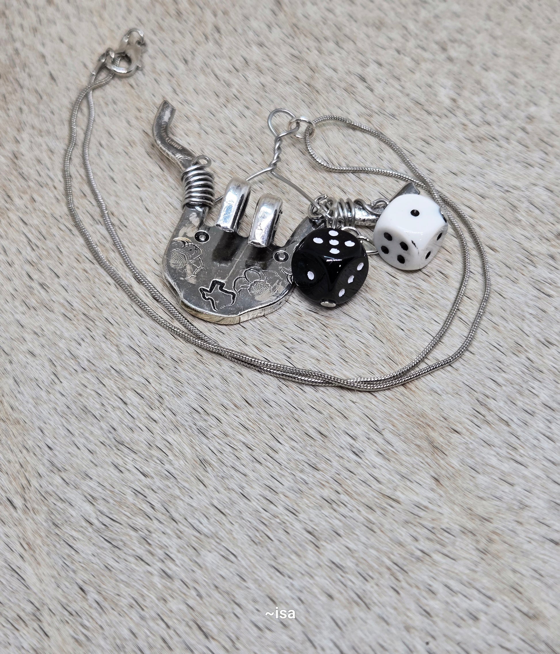 Get your hands on the Duce Heifer fork necklace - a unique, hand-stamped accessory featuring a dice charm. Perfect for adding a Texas twist to your style.