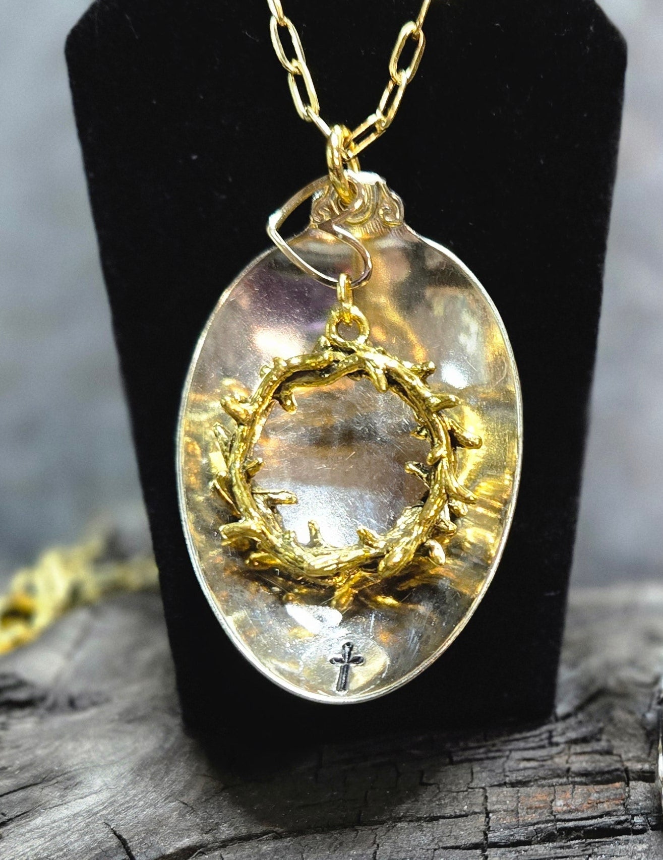 Indulge in luxury with our Crown Thorn Necklace. Crafted from gold, this regal necklace features a heart charm and cross stamping, all delicately placed on a silver-plated spoon bowl. Elevate your style and make a statement with this one-of-a-kind piece. Feel like royalty wherever you go.