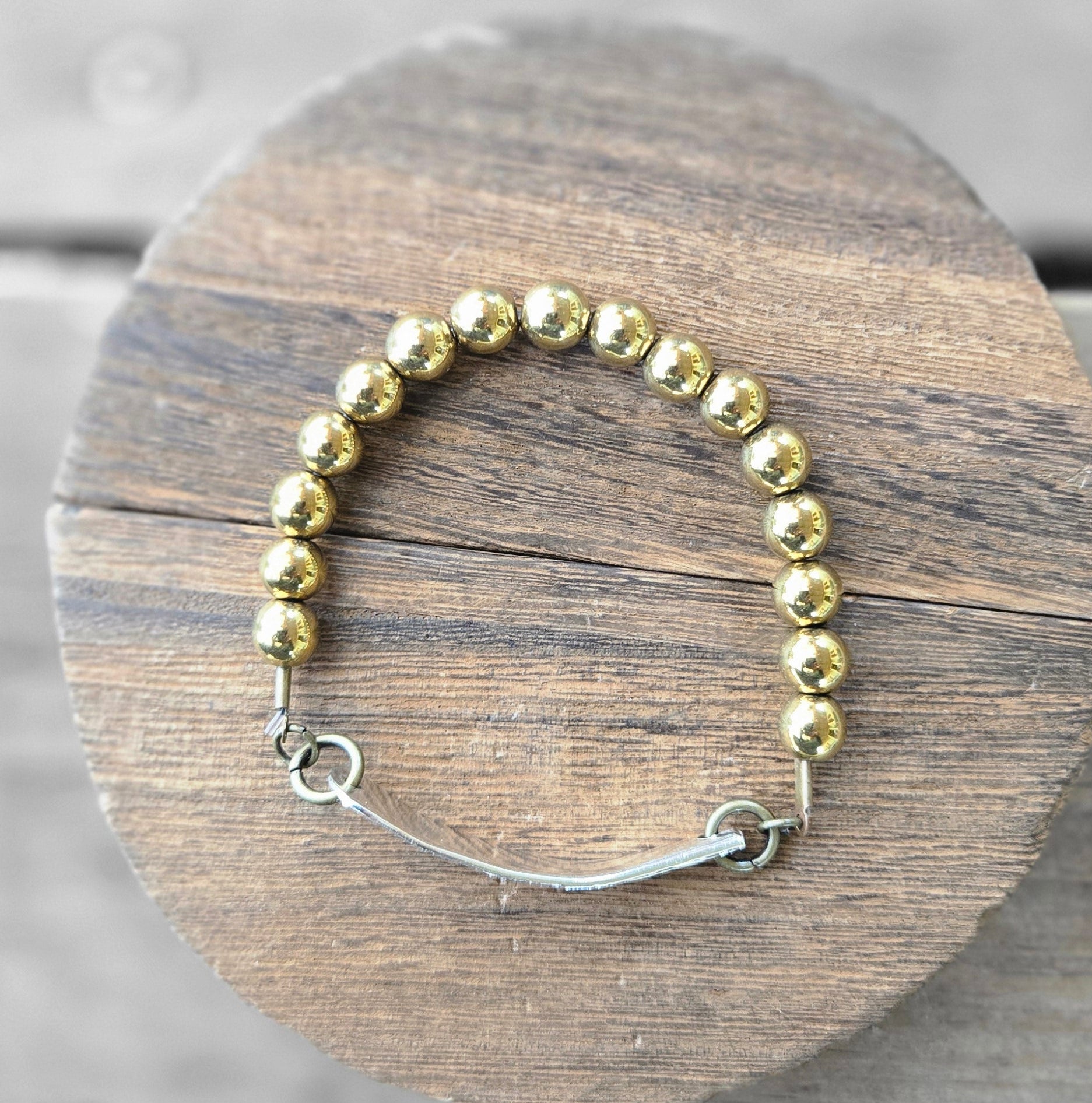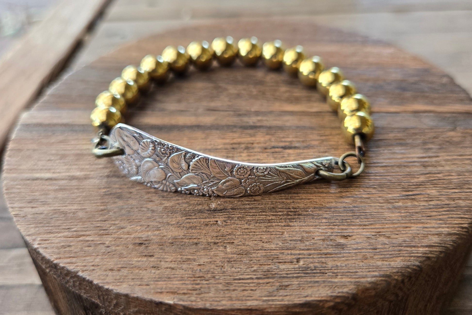 Elevate your style with our Gold Leaf bracelet. Crafted with a unique loose leaf design on a silver-plated spoon handle, adorned with luxurious gold beads and finished with a stretch bead cord. Slip it on for an effortless and comfortable fit for wrists 7-7.5 inches. Experience the opulence of our exclusive bracelet.