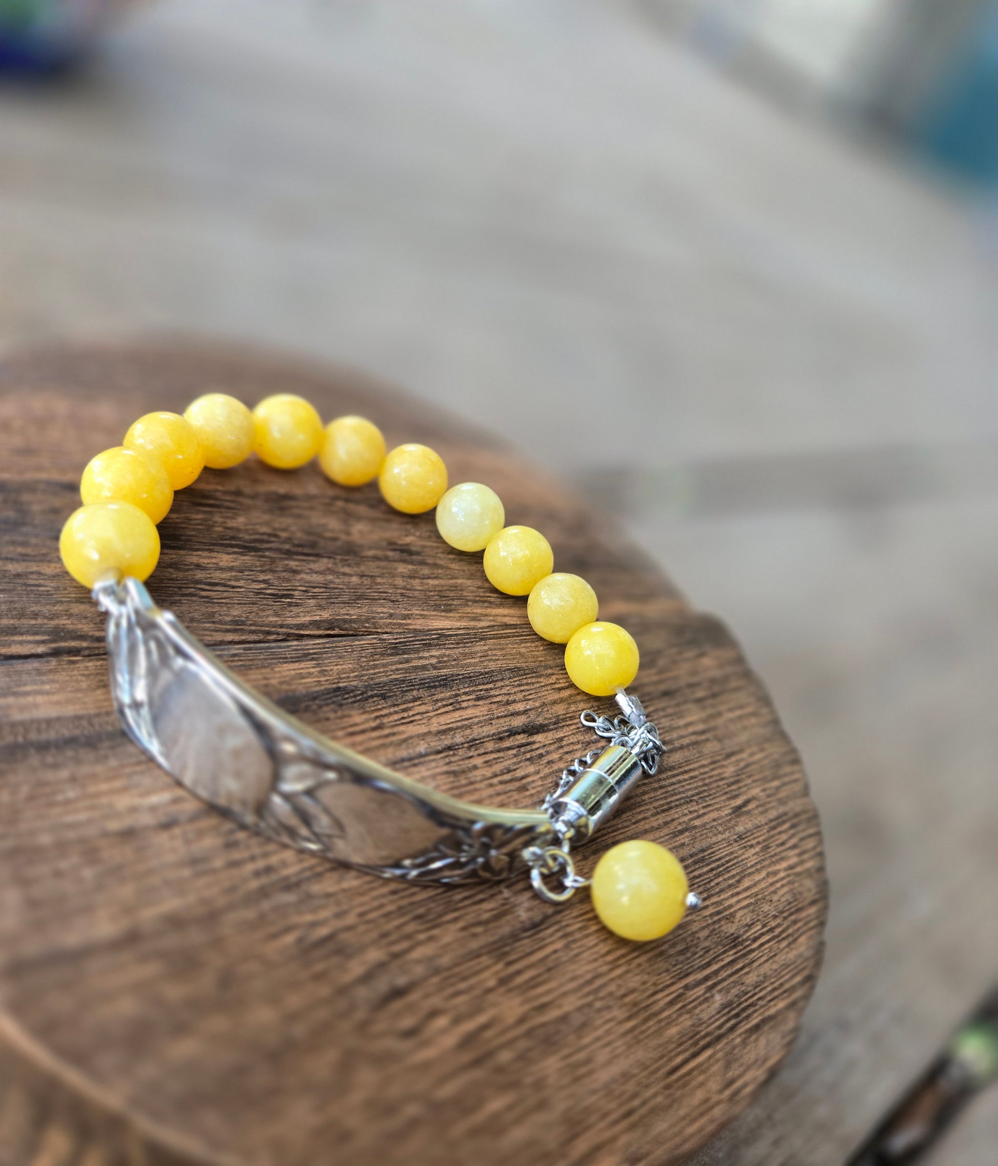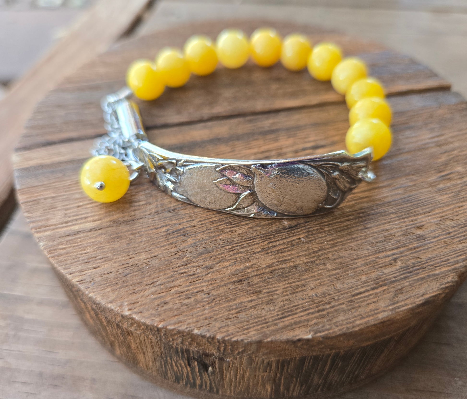 "Get a squeeze of fun with the Lemon Drop bracelet! Featuring a playful lemon design on a stainless steel spoon handle, this bracelet is sure to add a pop of color to any outfit. With vibrant yellow glass beads and durable stretch bead cord and magnetic clasp. , you'll be zesting up your style all day long. No sour faces here, just sweetness!"ย