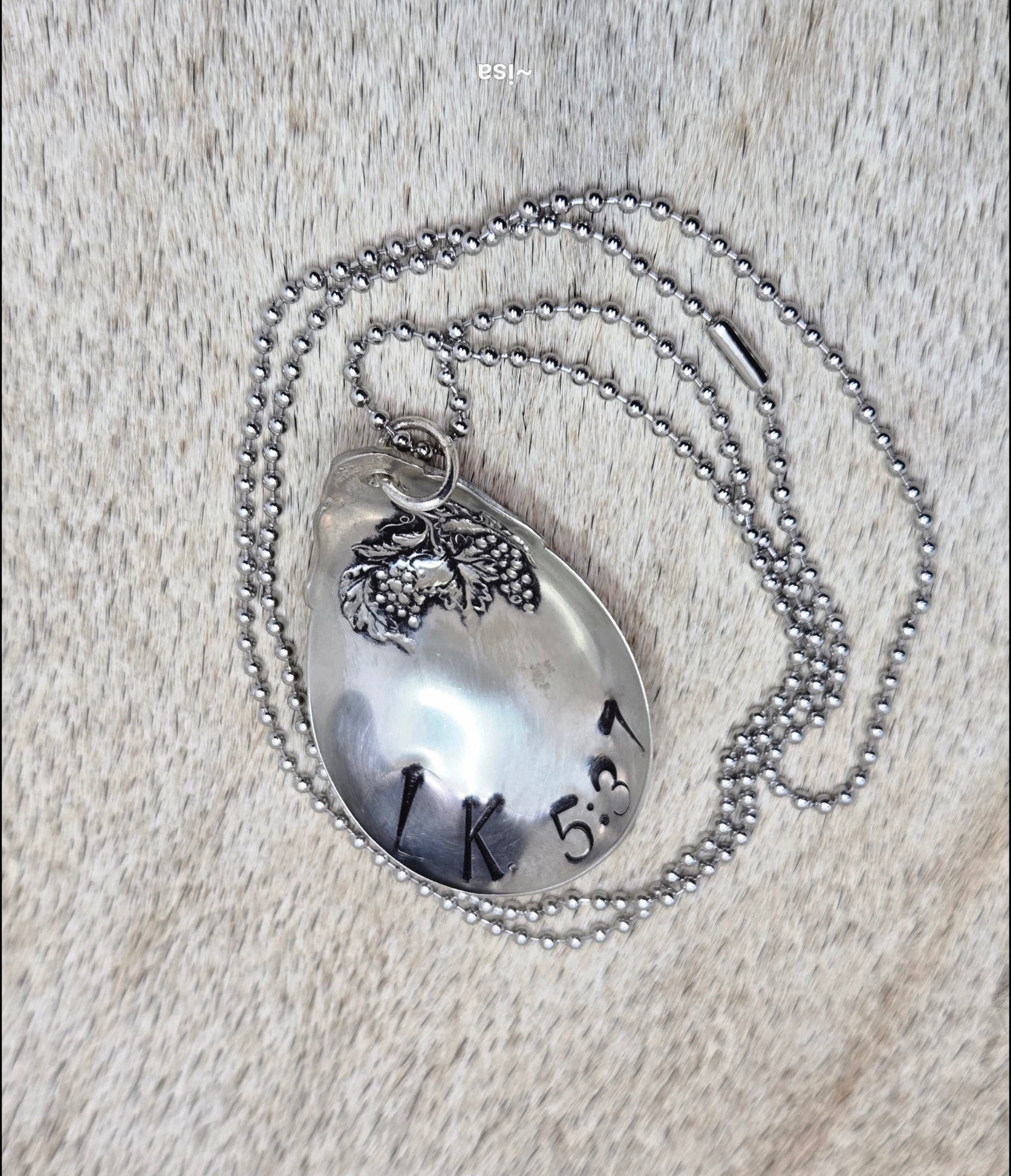 Add a touch of quirk to your accessory game with Luke 5:37! This silver-plated necklace features a hand-stamped and painted silver spoon bowl, hanging from a 28inch ball chain.